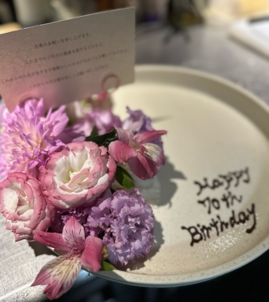 今回はメッセージ付きのプレート、古希ということで、紫のお花もご用意しました。
